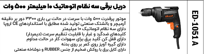 دریل برقی 10 میلی‌متر 500 وات سه نظام اتوماتیک کد محصول : ED-1051A