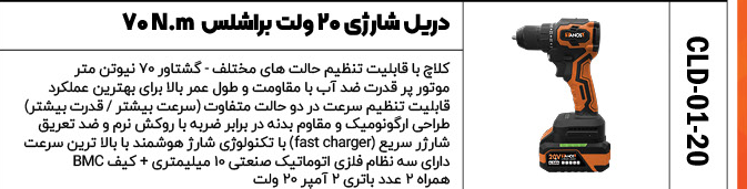 دریل شارژی براشلس 20 ولت 70 نیوتن متر کد محصول : CLD-01-20